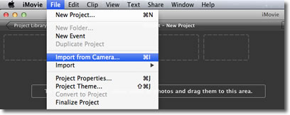 - En la ventana iMovie, haga clic en File y después en Import from Camera.