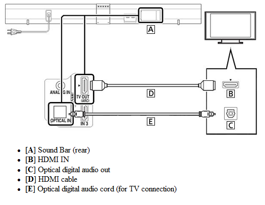 - A continuación, conecte un cable de audio óptico en la Optical digital audio out (Salida de audio digital óptico) en el televisor a la toma OPTICAL IN de la Barra de sonido (esto es necesario para escuchar el audio del televisor).